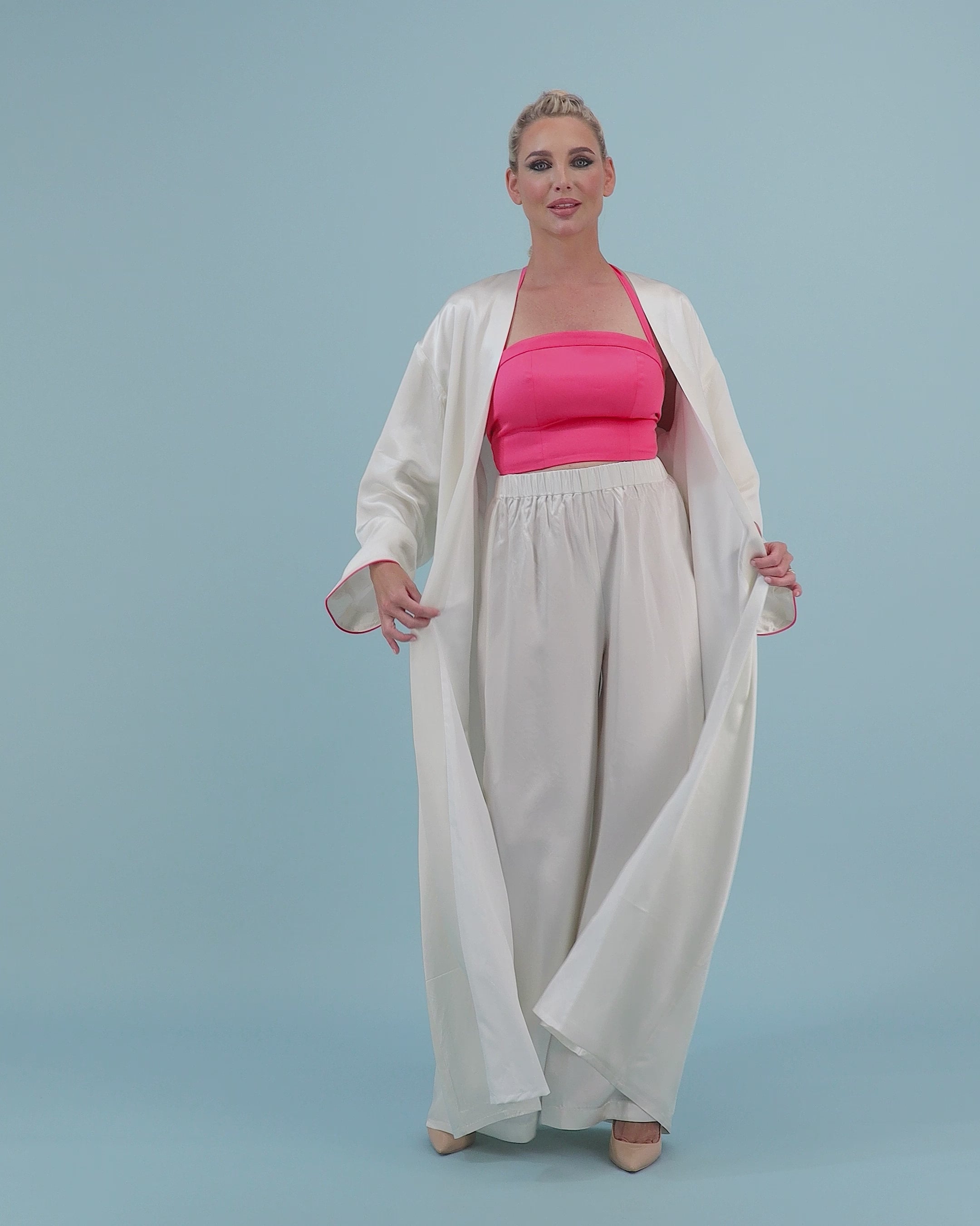 Made from premium Silk Satin sourced from Japan, these trousers boast a luxurious feel and elegant drape. Pair them with our brand's hot pink TILDA TOP for a stunning ensemble and elevate your look by combining them with THE MAYA KIMONO JACKET for added sophistication and flair. Versatile and timeless, THE MAYA TROUSERS offer endless styling options for any occasion.